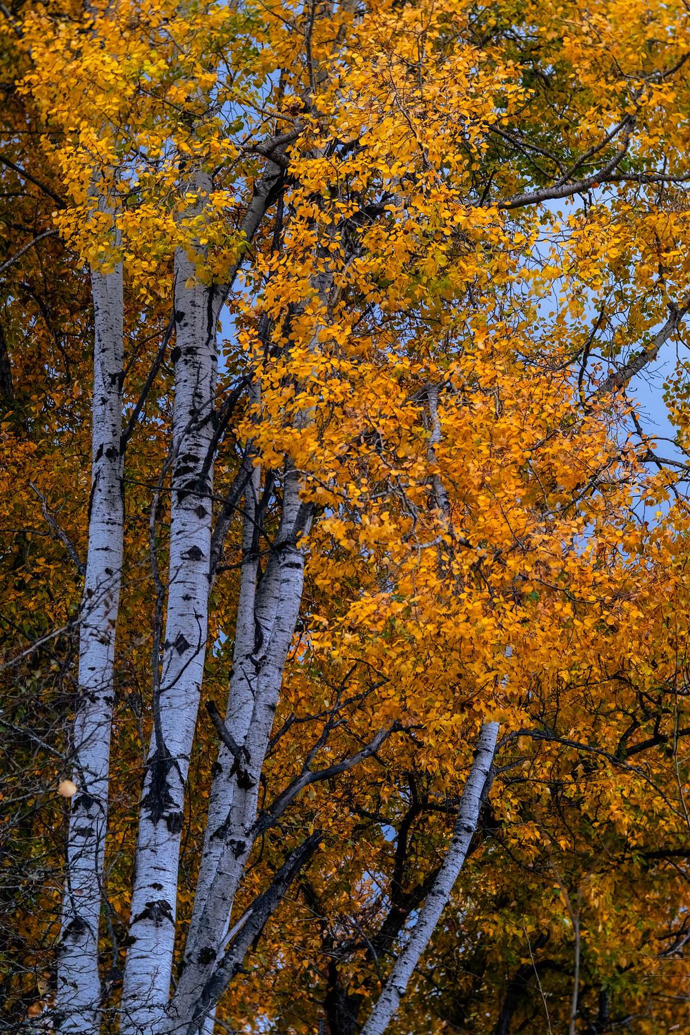 Birch trees in Autumn. Colorful leaves against a stormy sky. Sandpoint Idaho.
