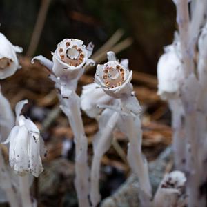 Ghost Pipe plants on the forest floor.